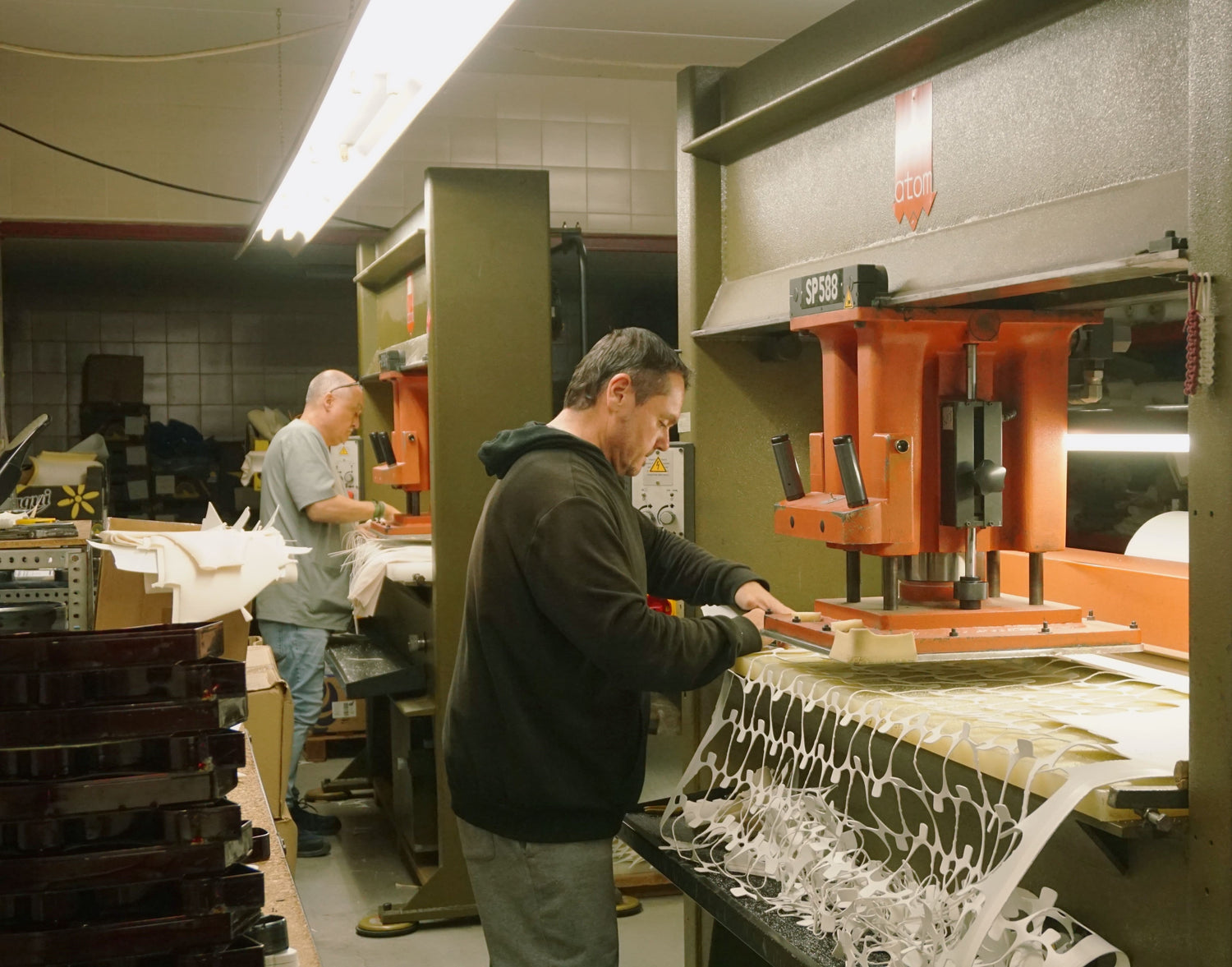 Découpe, collage, couture, façonnage, emballage… Tout le processus de fabrication est réalisé à la main avec soin et dévouement.