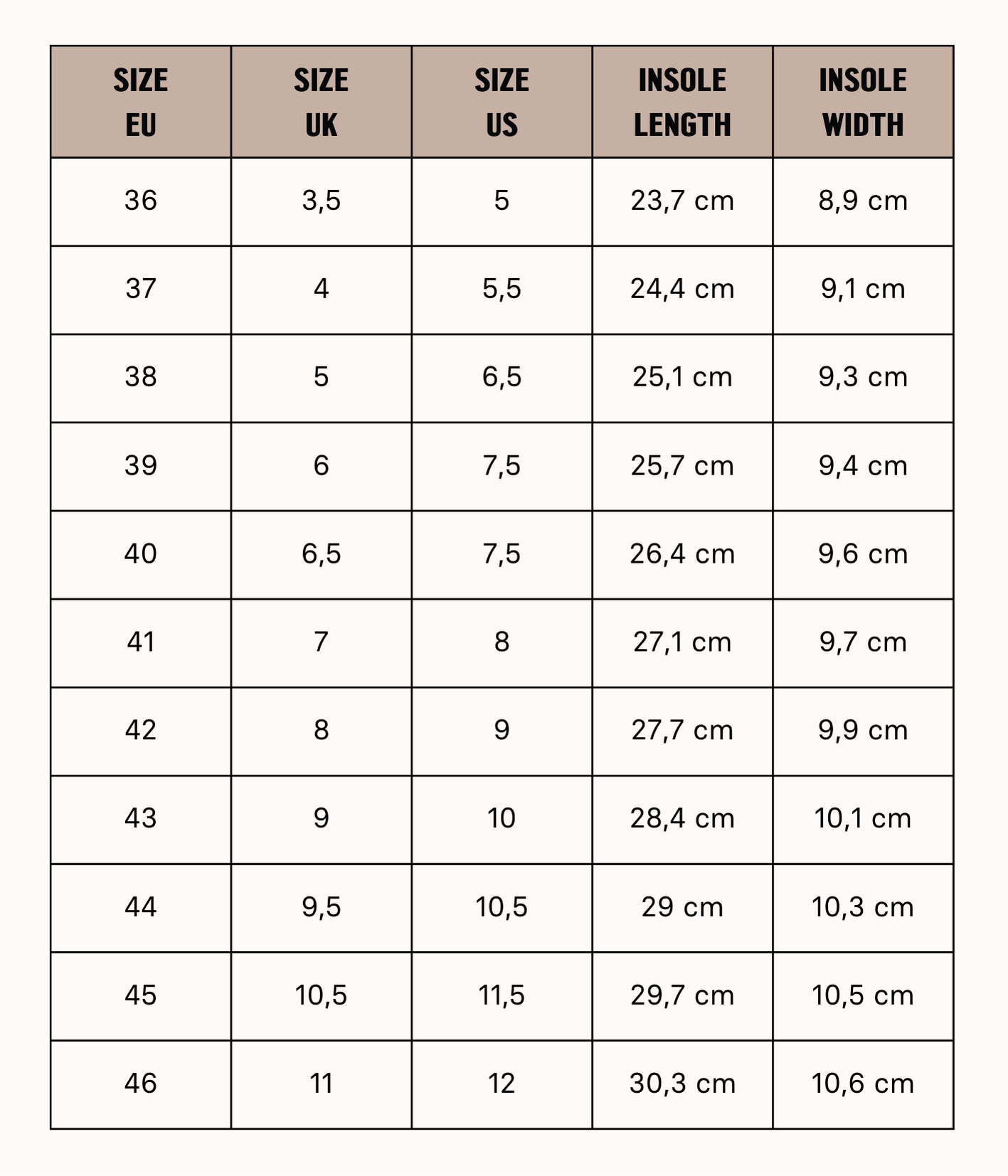 Take a pair of shoes that fit you well, remove the insole, measure it, and compare that measurement with our size guide.